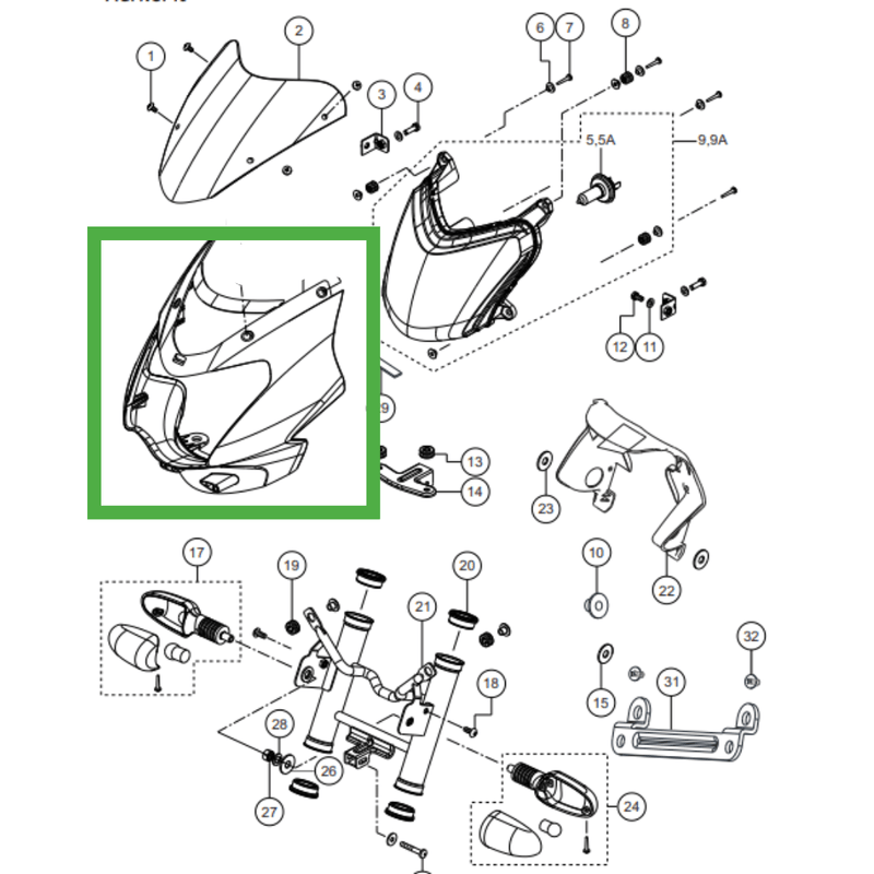 Peça desenvolvida para proteger o conjunto óptico (farol) e dar acabamento à parte frontal da moto, além de compor o visual original do modelo. Fabricada em plástico resistente na cor preta, torna a frente da moto mais protegida contra impactos leves e sujeiras.