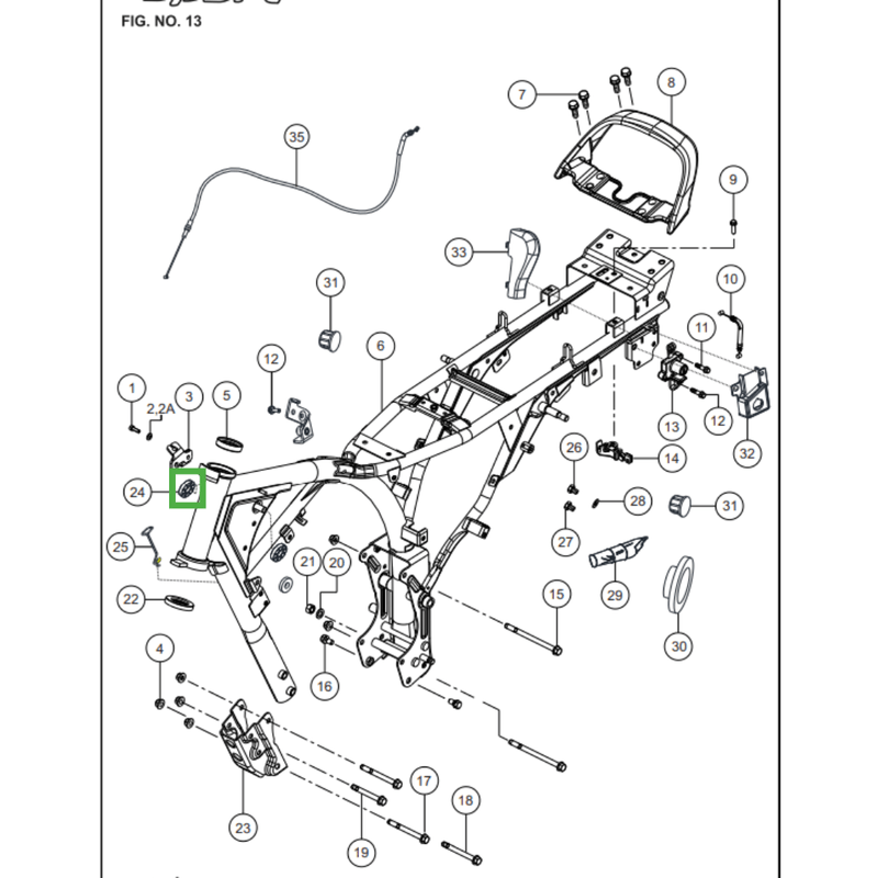 Componente de isolamento e absorção de impactos da Sport 110i KS/ESD, o coxim de borracha do chassi é responsável por reduzir vibrações e ruídos entre o chassi e os componentes fixados, proporcionando maior conforto, estabilidade e proteção estrutural. Fabricado em borracha resistente, contribui para a durabilidade do conjunto e o funcionamento suave da motocicleta.