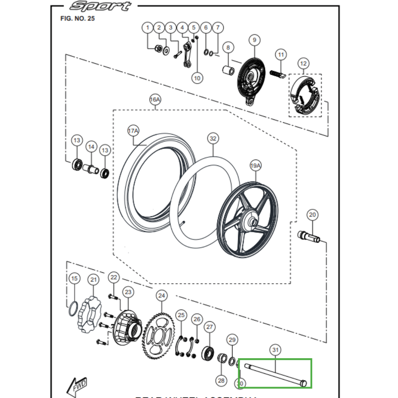 Peça utilizada para fixação e suporte da roda traseira no chassi da moto, permitindo o giro livre da roda e garantindo alinhamento e estabilidade durante o uso. O eixo da roda traseira é essencial para a segurança e o correto funcionamento do conjunto traseiro.