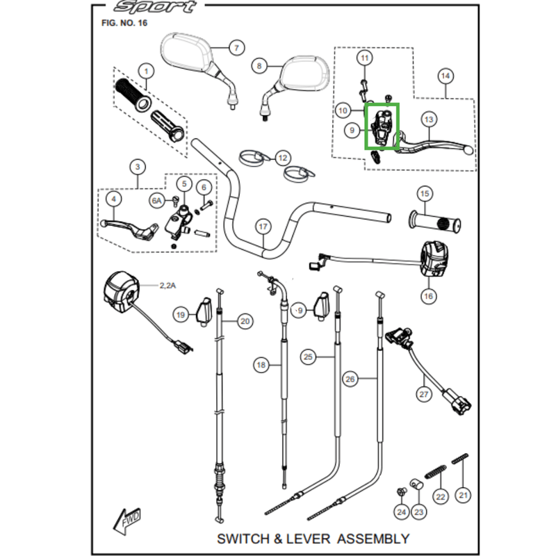 O manicoto esquerdo da embreagem é responsável por transmitir o acionamento do cabo da embreagem ao manete, garantindo precisão na frenagem, conforto e controle durante a condução. Essencial para substituição de manicotos desgastados ou manutenção do sistema de embreagem.