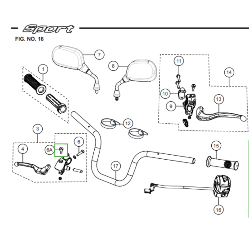 Componente de fixação utilizado na manete do freio, com medida M6x1x33, responsável por garantir o correto posicionamento e funcionamento do conjunto da manete. Deve ser compatível com o modelo da motocicleta. Sendo compatível apenas para Sport KS.