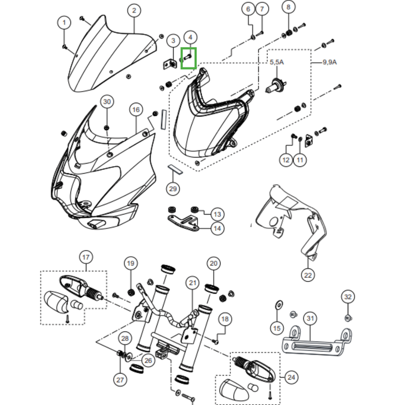 Peça utilizada na fixação do suporte do manicoto, placa da embreagem e carenagem frontal da moto. O parafuso proporciona firmeza e segurança na montagem destes componentes, evitando folgas e garantindo o correto alinhamento das peças.