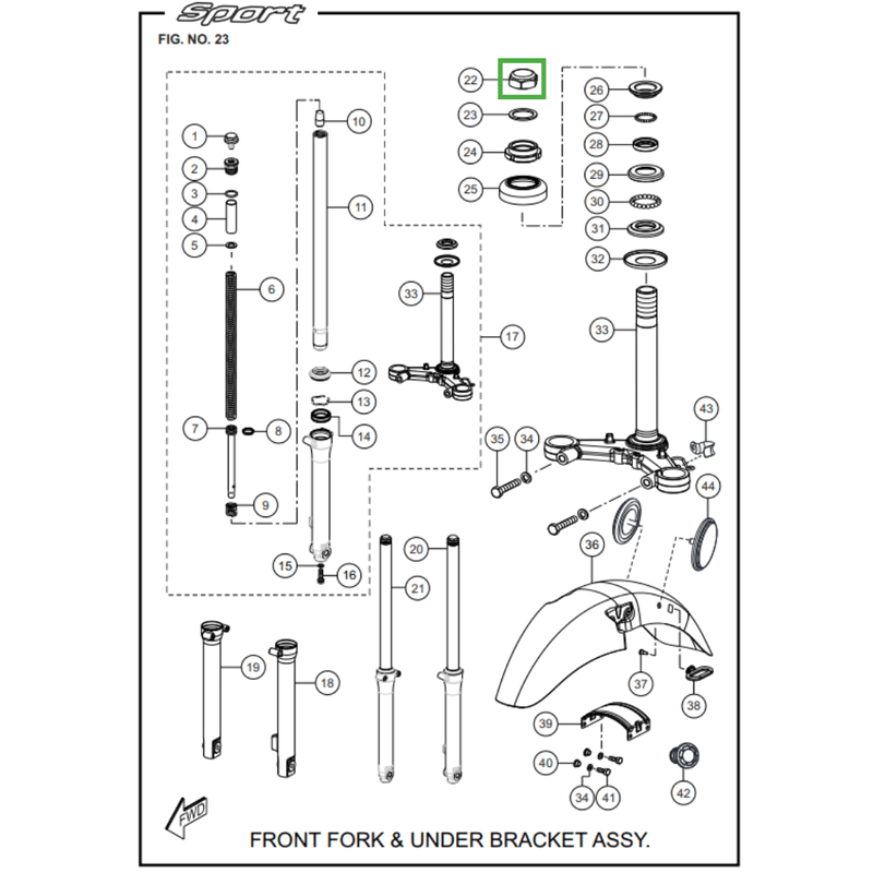 Componente de fixação instalado na parte superior da coluna de direção, responsável por garantir o aperto e a trava correta do conjunto de direção da motocicleta. Essencial para manter o alinhamento, a estabilidade e a segurança na condução, evitando folgas ou movimentos indesejados no guidão. Indicada para reposição em manutenções da coluna de direção da Sport KS/ESD, assegurando funcionamento preciso e seguro do sistema.