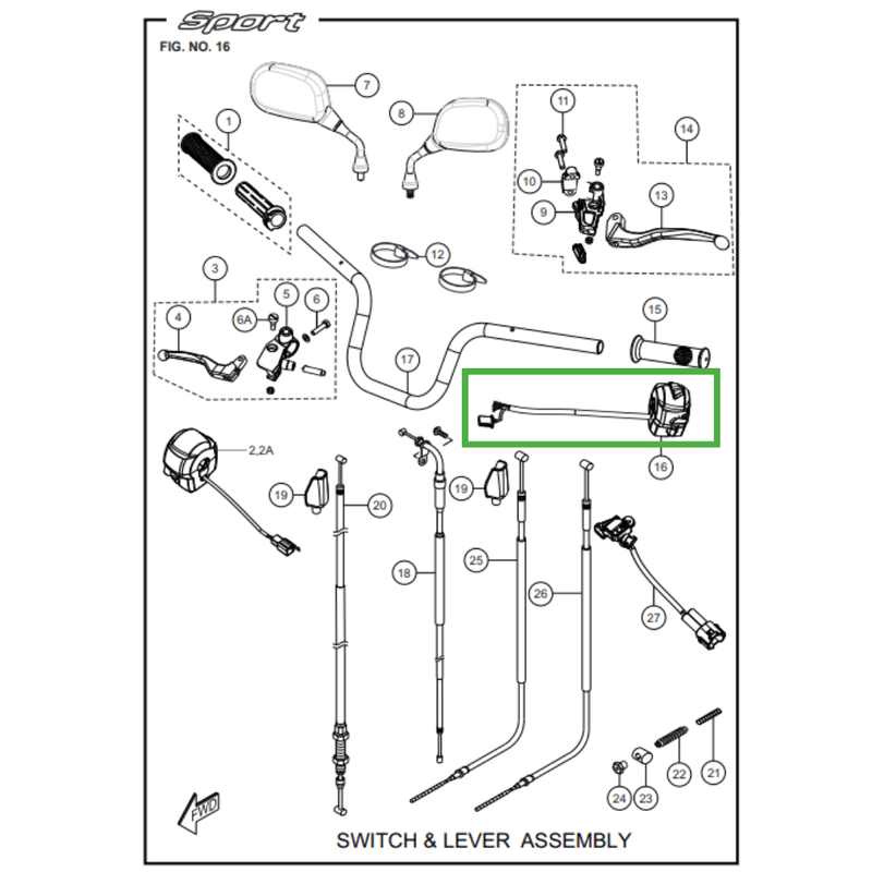 O punho de luz lado esquerdo é responsável por acionar os sistemas de iluminação da motocicleta, garantindo controle fácil e seguro das luzes dianteiras e indicadoras. Essencial para substituição de punhos danificados ou manutenção do sistema elétrico original.