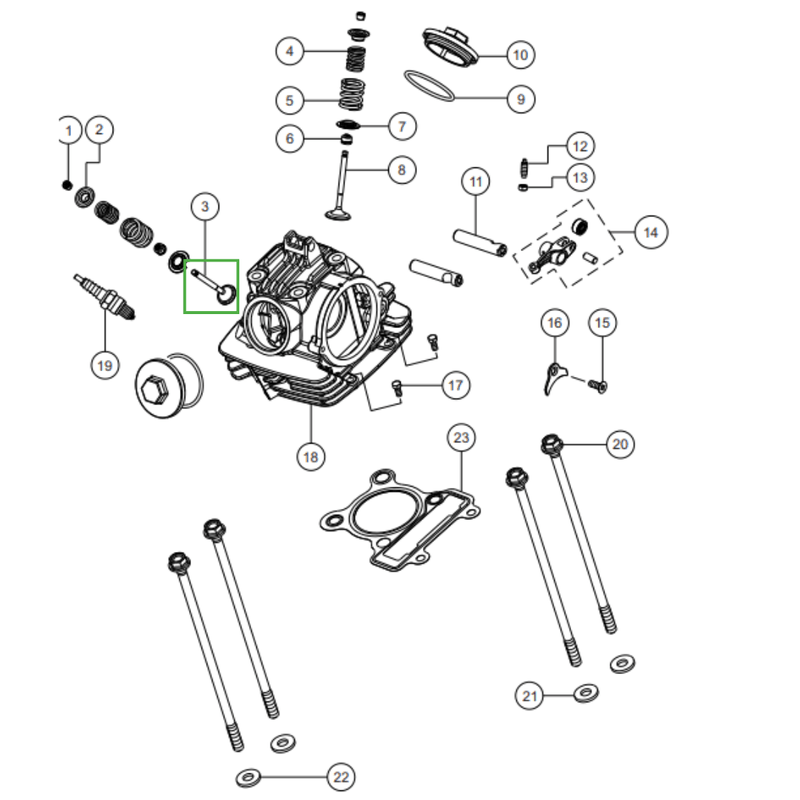Componente do sistema de válvulas do motor da Sport 110i KS/ESD, responsável por controlar a saída dos gases de combustão do motor. A válvula de escape em aço garante resistência a altas temperaturas, funcionamento eficiente do motor e correto desempenho do sistema de exaustão, contribuindo para a durabilidade, potência e confiabilidade do conjunto do motor.